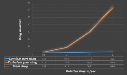 The boundary layer determines the viscous friction drag as a function of the velocity and the length of the surface in contact with the fluid. The friction drag varies strongly according to the turbulence of the boundary layer, in the laminar zone it is very weak and in the turbulent zone it is stronger. The calculation of the friction drag force is therefore divided into 2 parts, the laminar layer and the turbulent layer. The objective here is not to detail these calculation methods, Let's use the Mecaflux software to establish an evaluation for different speeds of: