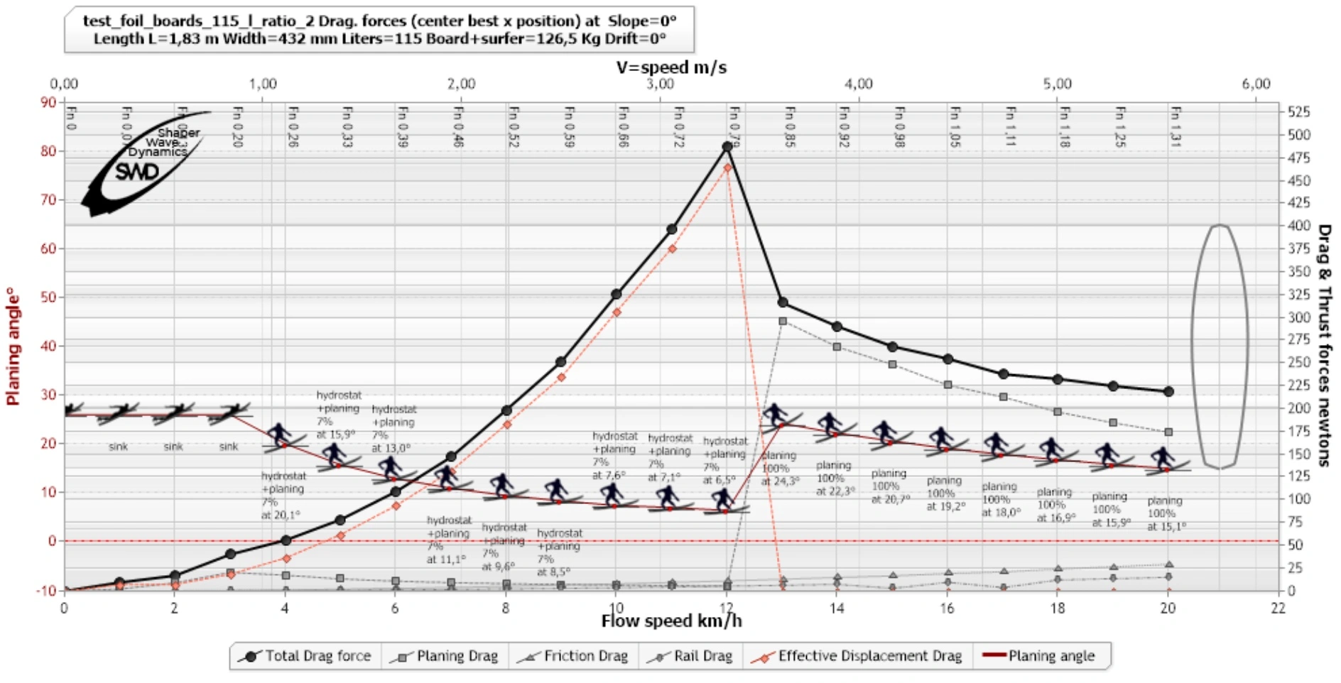 Description générée automatiquement En début de plages de vitesse, le surfeur de 120 kg ne pourra pas être debout il devra atteindre une vitesse pour créer un apport supplémentaire de portance avec du planing. La ligne d’incidences est a 25 degrés environ et la silhouette de surfeur en position de rame indique la mention « sink », qui signifie que la portance est insuffisante, et que le surfeur est partiellement immergé. Cette plage de non flotabilité se termine lorsque l’apport de planing devient suffisant pour porter le surfeur. Pour le ratio 4.6 , la combinaison force hydrostatique+portance de planing est atteinte a partir de 3 km/h, pour les autres ratio il faudra atteindre 4 km/h. Cette phase transitoire de « water start » genere une trainée de déplacement relative au poid du surfeur jusqu’à atteindre la vitesse de planing. Une image contenant texte, Logiciel multimédia, logiciel, Logiciel de graphisme