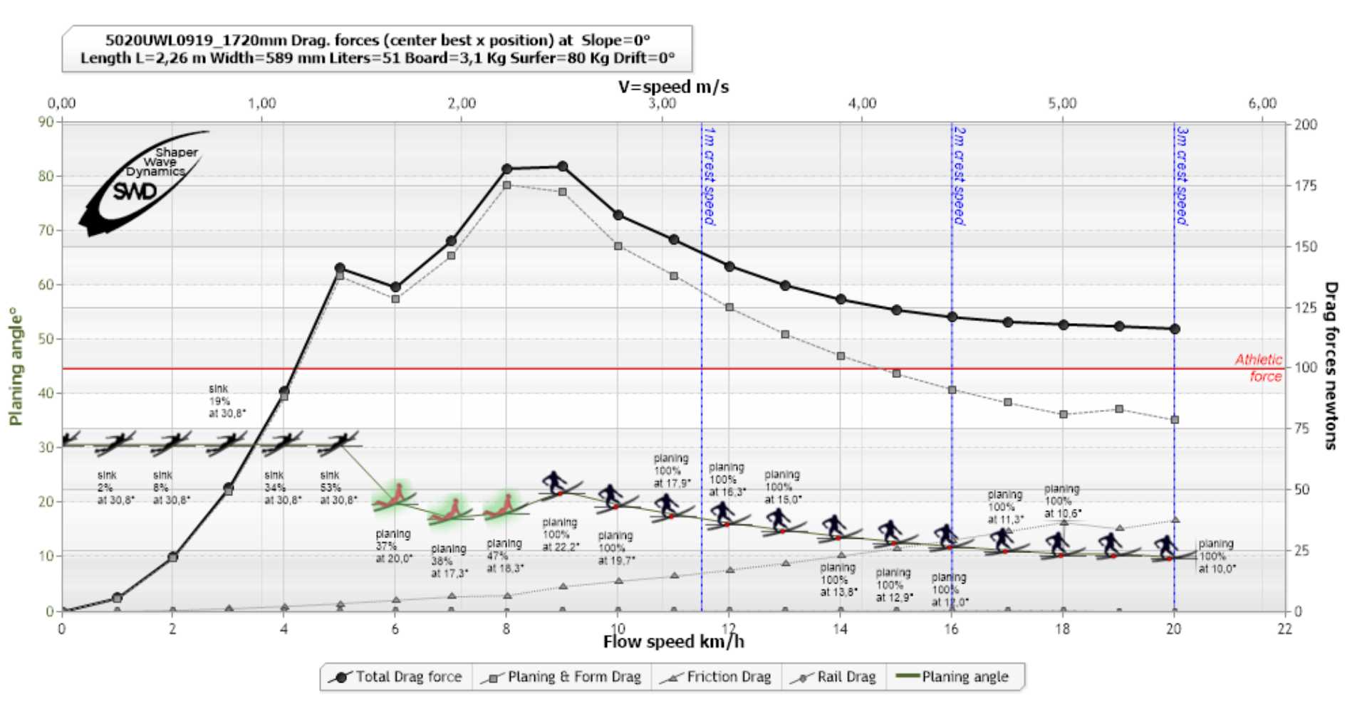 Le diagramme de traînée hydrodynamique, montre comment les forces de résistances de friction et de forme (ou planing) se combinent en fonction des angles d'incidence et de la vitesse relative du surfer, en position de génération de traînée minimale sur sa planche: