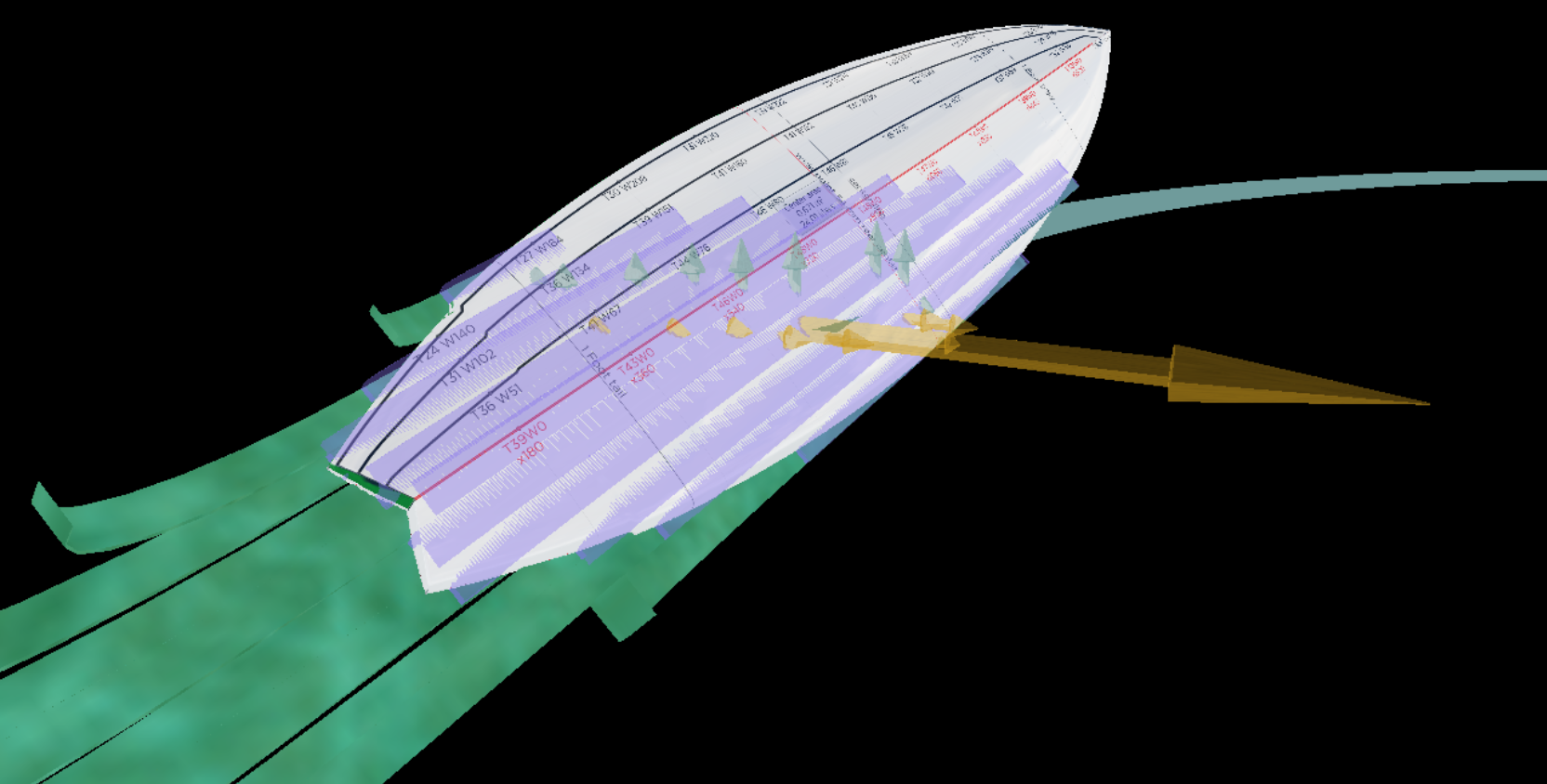 En dessinant une carte des positions sur une planche donnée, à vitesse, poids surfeur et pente de vague donnés, et en affichant, suivant un code couleur, les angles de roulis, les rayons de courbe trajectoire et les forces de traînées, qui définissent la capacité a changer de vitesse et les angles d'incidences qui sont la cause de ces phénomènes hydrodynamiques, nous obtenons un "HydroScan" argumentant objectivement la manœuvrabilité d'une planche, nue sans ailerons.( Nous explorerons l'impact des ailerons séparément dans le chapitre traitant de la dynamique des ailerons).