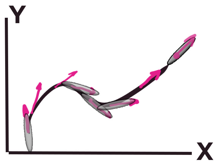 - Changer de direction= Le centre de gravité est naturellement positionné vers l’intérieur du virage pour compenser la force centrifuge. Il est surprenant de voir comme notre esprit est apte au vol, il suffit de regarder un enfant courir en imitant un avion, il penche ses bras en ailes vers l’intérieur du virage comme pour prendre appui sur l’air, comme le fait l’oiseau, l’avion ou le dauphin avec ses pectorales dans un virage serré.